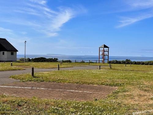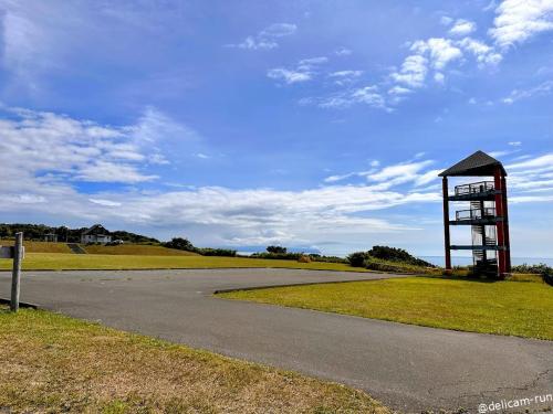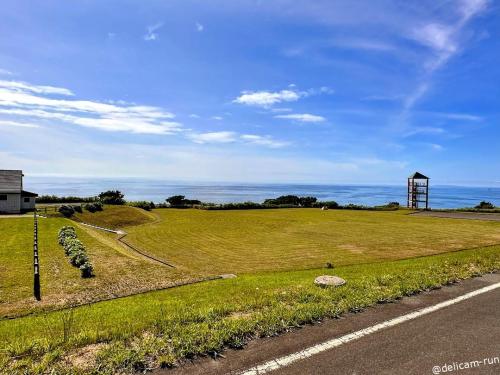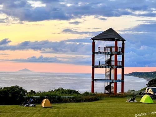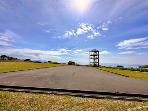 「望洋台キャンプ場」には日本海と果てしなく北上するオロロンライン、遠くに利尻富士や天売焼尻島の絶景を眺める展望台が聳え立ってます。