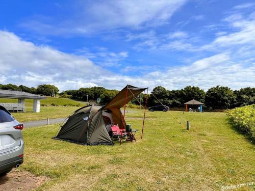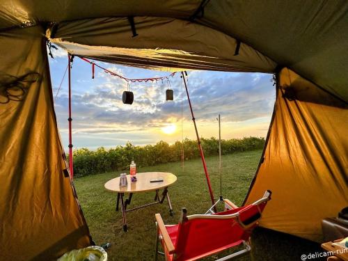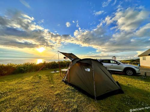 目の前の草木が低い電源なしオートサイトからはテントの中からも日本海に沈む夕陽を眺めることが出来ます。
