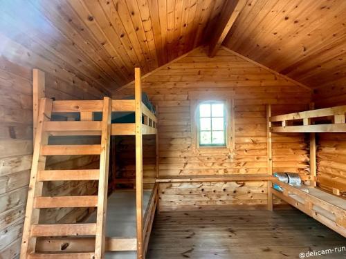 バンガロー内を撮影。2段ベットが二つと簡素かつウッディーな作りでキャンプに来たという感じになりますね。