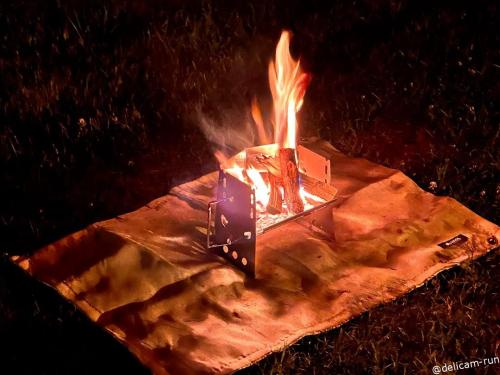 「望洋台キャンプ場」での焚き火は可能です。もちろん直火は禁止で焚き火実施の際には焚き火台を使用して芝保護シートを敷いて楽しみましょう♪