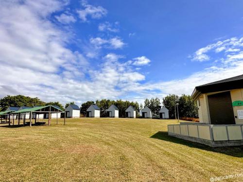 昔の青少年家族旅行村的な雰囲気を残すバンガローの佇まい。目の前には広大なフリーテントサイトの芝生が広がてますので、タープを張るスペースもありそうです。