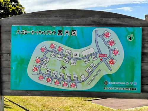 続いてオートバンガローをご紹介。その名の通り車を横付けできるバンガローということです。オートバンガローは電源付きオートサイトを取り囲むように点在している10棟と、電源付きオートサイト右側の4棟に分かれてます。